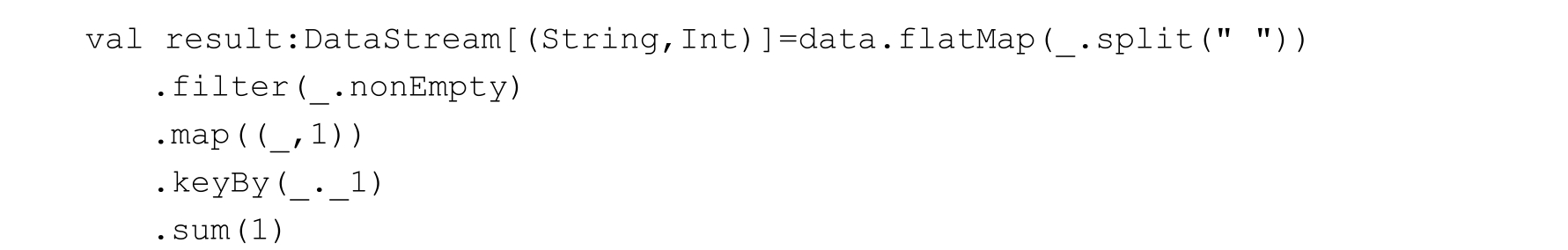接下来对读取的数据集应用一系列转换操作进行处理。例如,使用flatMap()操作将单词按照空格进行分割并将结果合并为一个新的DataStream数据集;使用filter()操作过滤数据集中的空字段;使用keyBy(_._1)操作按照每个元素的第一个字段进行重新分区(关于分区,将在2.3节详细讲解),第一个字段(即单词)相同的元素将被分配到同一个分区中;使用sum(1)操作按照数据集元素的第二个字段进行求和累加。代码如下: