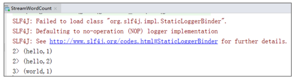 计数结果前面的数字表示的是执行线程的编号,且相同单词所属的线程编号一定是相同的。从计数结果可以看出,随着数据源不停地发送数据,单词的计数数量也在不断增加。