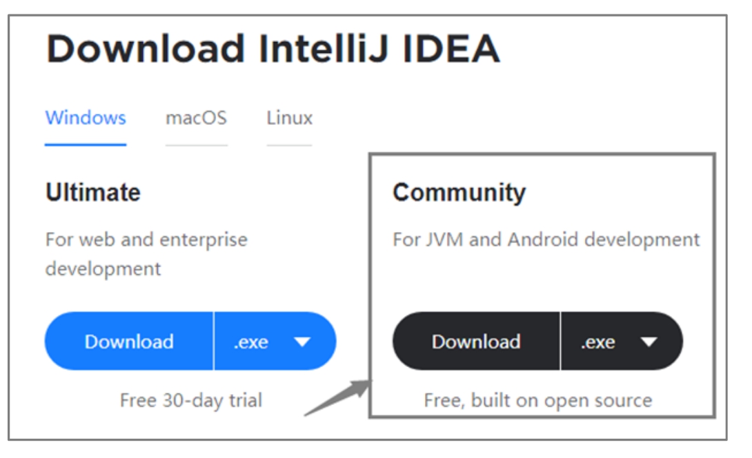 访问IDEA官网(https://www.jetbrains.com/idea/download),选择开源免费的Windows版进行下载,如图1-17所示。
