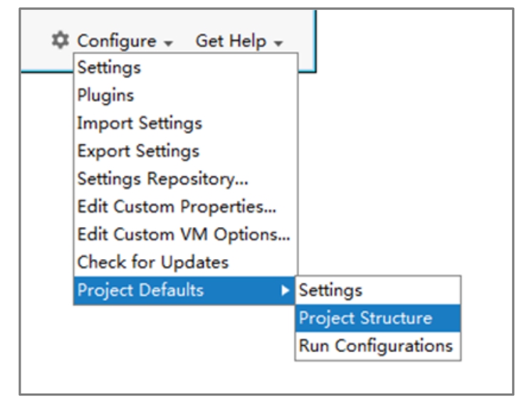 启动IDEA后,选择欢迎界面下方的Configure→Project Defaults→Project Structure命令,如图1-21所示。