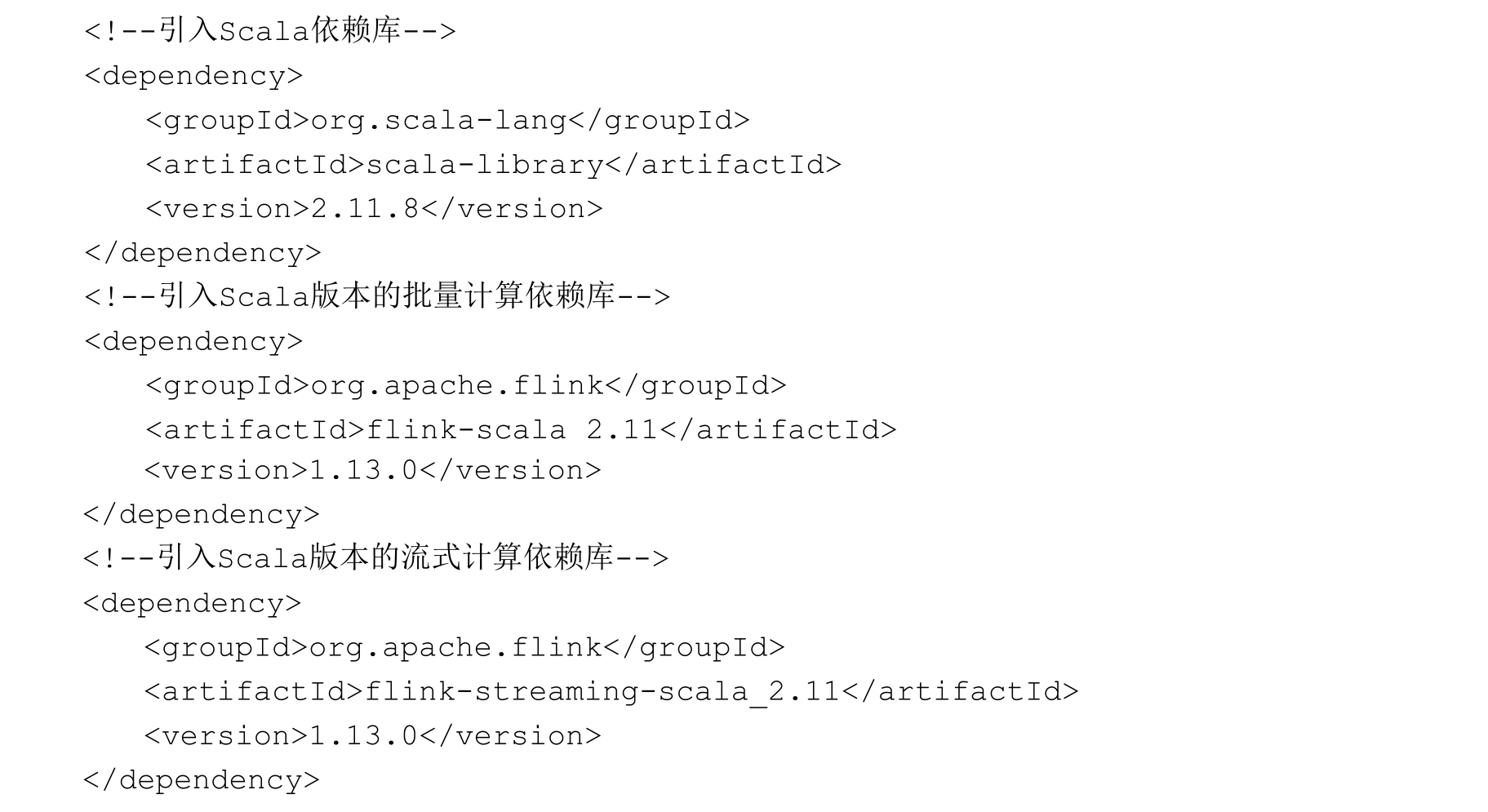 需要注意的是,Flink依赖库flink-scala_2.11和flink-streaming-scala_2.11中的2.11代表使用的Scala版本,必须与引入的Scala库的版本一致。
