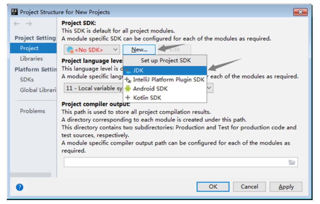 在弹出的窗口中选择左侧的Project项,然后单击窗口右侧的New...按钮,选择JDK项,设置项目使用的默认JDK,如图1-22所示。