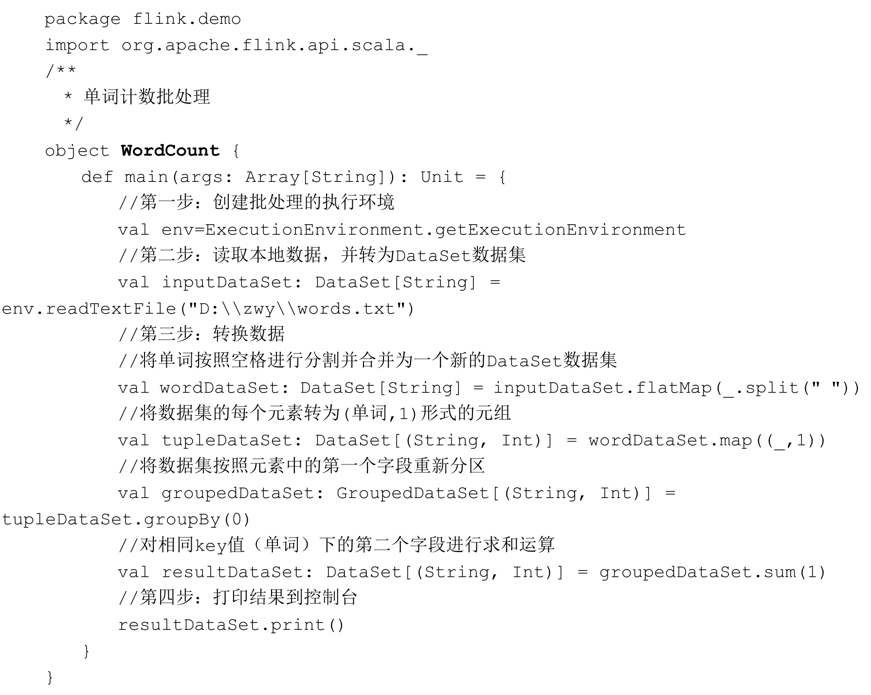 在项目的flink.demo包中新建一个WordCount.scala类,然后向其写入批处理单词计数的程序,程序编写步骤如下。