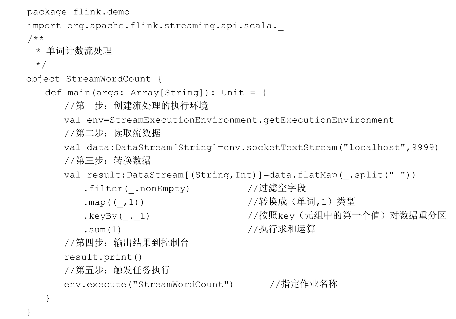 在项目的flink.demo包中新建一个StreamWordCount.scala类,然后向其写入流处理单词计数的程序,程序编写步骤如下。