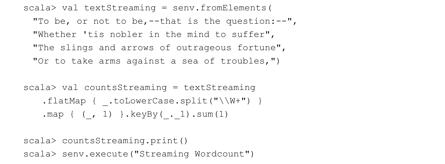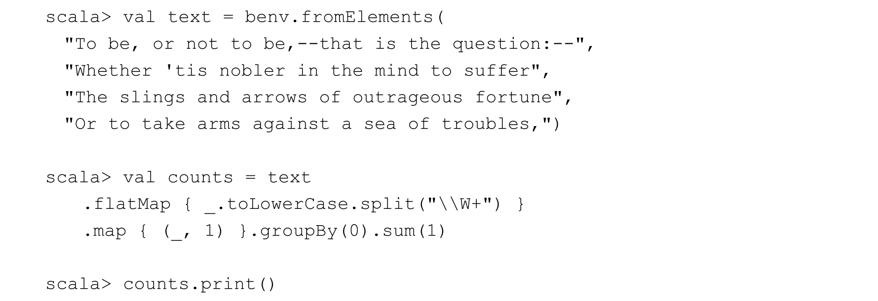 Flink Shell启动后,可以使用Scala语言编写Flink应用程序并提交,例如编写一个批处理的单词计数程序,代码如下: