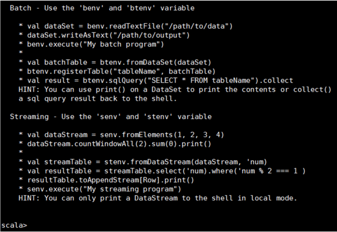 Flink Shell支持DataSet、DataStream、Table API和SQL。启动Flink Shell后会自动创建4个不同的执行环境来实现批处理或流处理程序(即自动创建4个变量)。使用benv和senv分别代表批处理环境(ExecutionEnvironment)和流处理环境(StreamExecutionEnvironment),使用btenv和stenv分别代表批处理表环境(BatchTableEnvironment)和流处理表环境(StreamTableEnvironment)。进一步讲,这4个变量分别是ExecutionEnvironment、StreamExecutionEnvironment、BatchTableEnvironment、StreamTableEnvironment的实例,可以在Flink Shell中直接使用,不需要再次创建。
