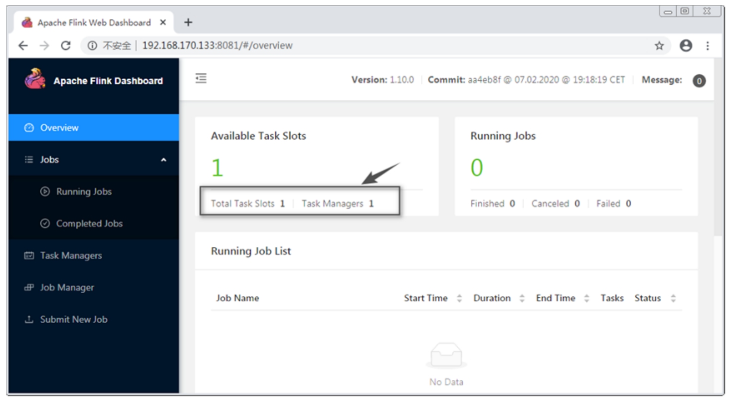 此时在浏览器中访问当前主机的8081端口即可查看Flink的WebUI,此处访问http://192.168.170.133:8081/,如图3-32所示。