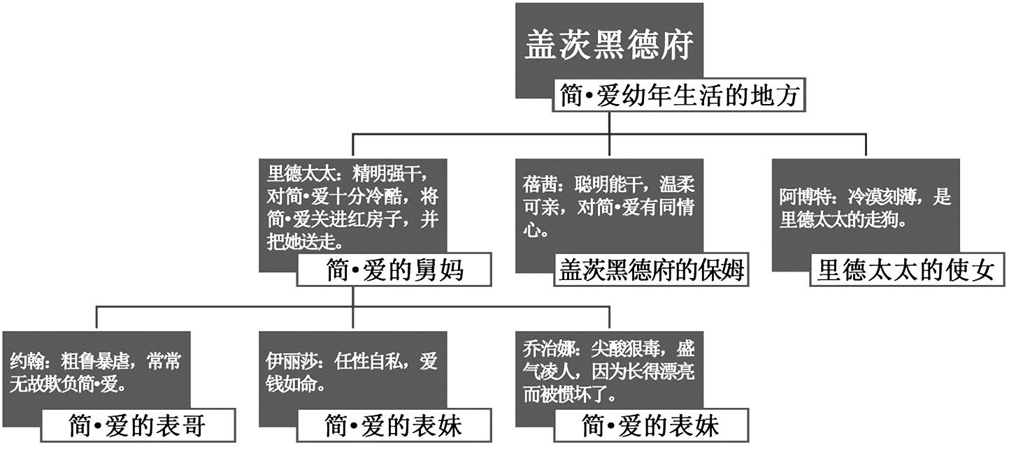 任务要求:依据简·爱在盖茨黑德府的人物关系,绘制《简·爱》的“人物关系图”。