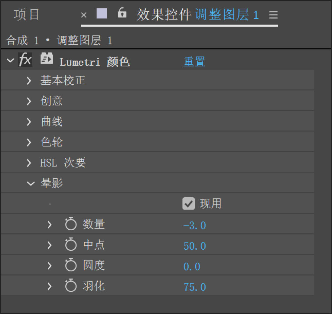9 展开“晕影”选项,设置“数量”参数为-3,“羽化”参数为75,如图5-9所示。当前影片的旧化效果如图5-10所示。