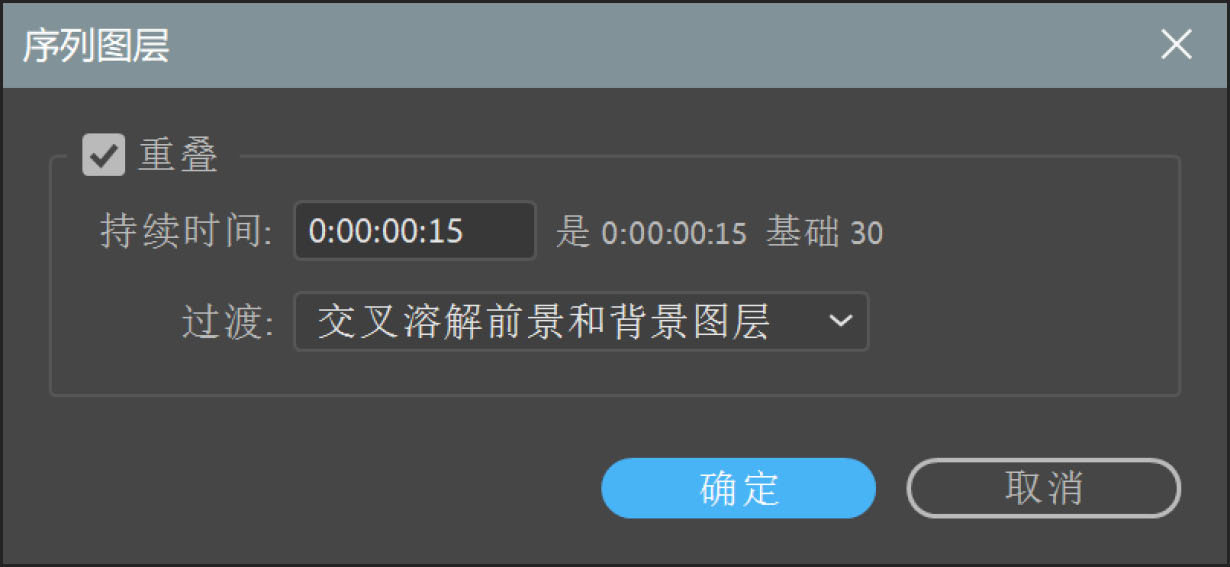 4 选择“动画→关键帧辅助→序列图层”命令,打开“序列图层”对话框。勾选“重叠”复选框,设置“持续时间”为15帧,在“过渡”下拉列表框中选择“交叉溶解前景和背景图层”,单击“确定”按钮完成设置,如图5-4所示。