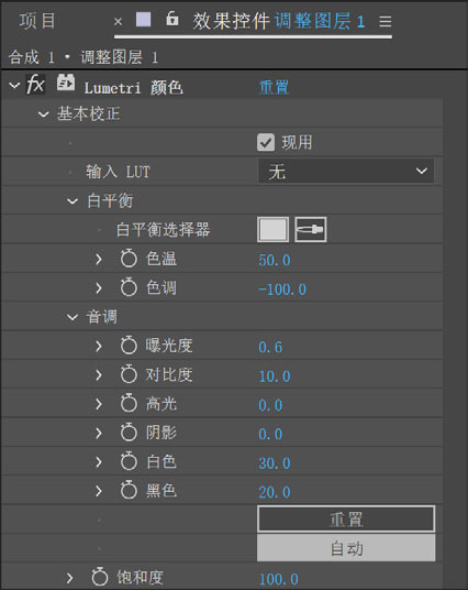 7 选择“图层→新建→调整图层”命令,继续选择“效果→颜色校正→Lumetri颜色”命令。在“效果控件”面板中展开“基本校正”选项,设置“色温”参数为50,“色调”参数为-100,“曝光度”参数为0.6,“对比度”参数为10,“白色”参数为30,“黑色”参数为20,如图5-7所示。