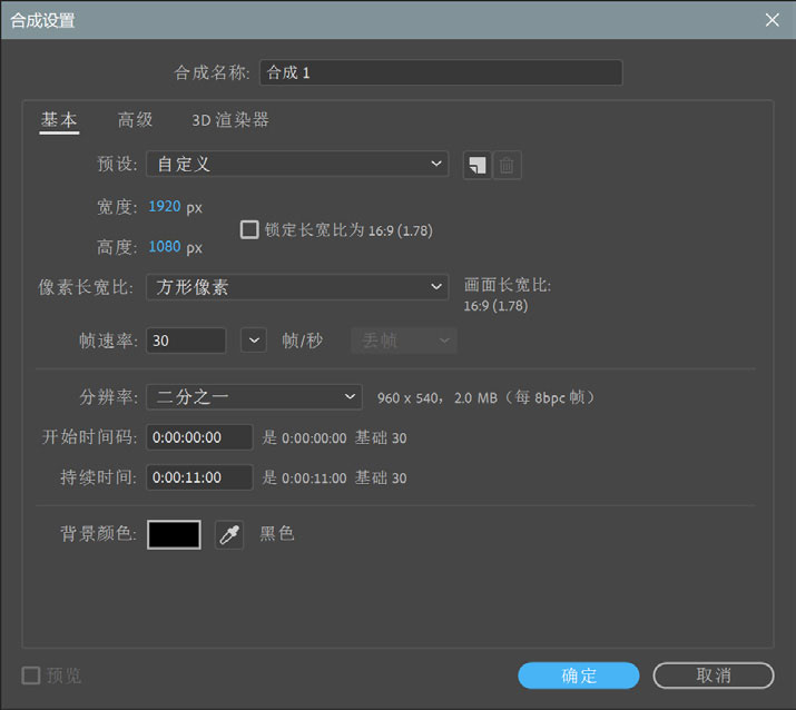 2 单击“合成”面板中的“新建合成”按钮,弹出“合成设置”对话框,设置合成尺寸为1920×1080,“帧速率”为30,“持续时间”为11秒,其他沿用系统默认值,单击“确定”按钮生成合成,如图5-2所示。