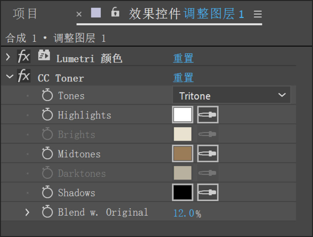 10 选择“效果→颜色校正→ CC Toner”命令。在“效果控件”面板中设置“Blend w. Original”参数为12%,如图5-11所示。