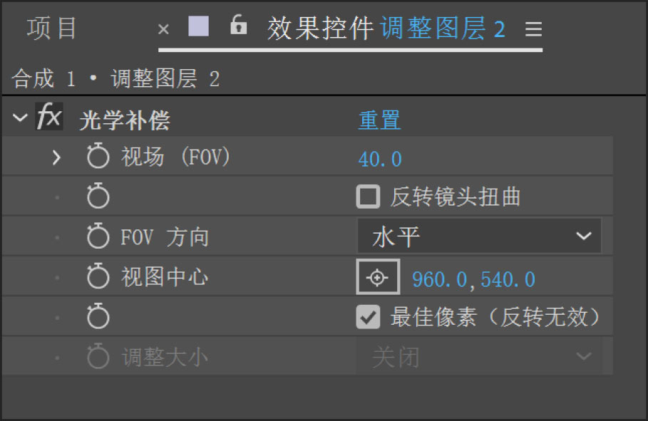 13 选择“图层→新建→调整图层”命令,继续选择“效果→扭曲→光学补偿”命令。在“效果控件”面板中设置“视场(FOV)”参数为40,勾选“最佳像素(反转无效)”复选框,如图5-15所示。