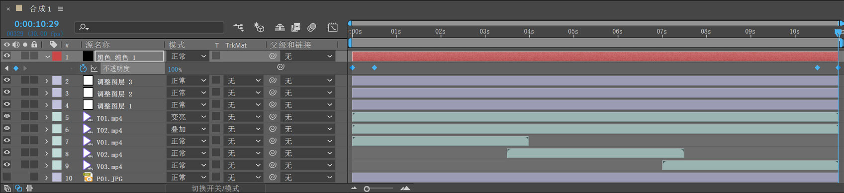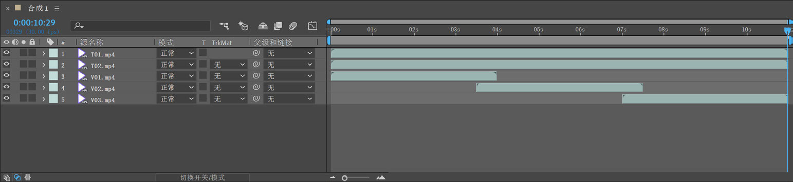 5 依次将“项目”面板上的“T02.mp4”和“T01.mp4”拖动到“时间轴”面板上。按住Alt键将第1层和第2层的出点均拖动到10秒29帧处,如图5-5所示。