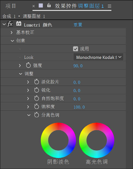 8 展开“创意”选项,在“Look”下拉列表框中选择“Monochrome Kodak5218 Kodak 2395”,设置“强度”参数为90,如图5-8所示。
