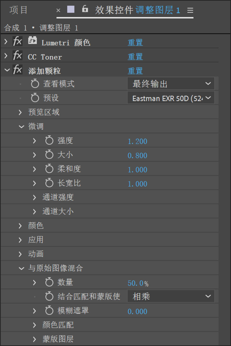11 选择“效果→杂色和颗粒→添加颗粒”命令。在“查看模式”下拉列表框中选择“最终输出”,在“预设”下拉列表框中选择“Eastman EXR 50D”,设置“强度”参数为1.2,“大小”参数为0.8。展开“与原始图像混合”选项,设置“数量”参数为50%,如图5-12所示。“CC Toner”效果的各项参数含义可参见技术补充5-1。