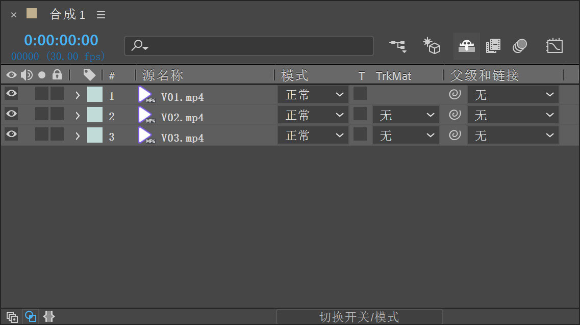 3 依次将“项目”面板中的“V01.mp4”“V02.mp4”和“V03.mp4”素材拖动到“时间轴”面板上,如图5-3所示。