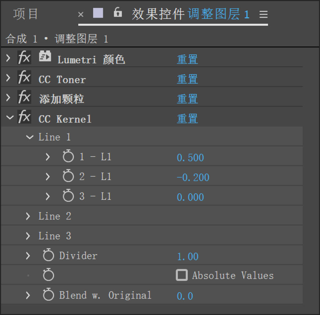12 选择“效果→颜色校正→ CC Kernel”命令。在“效果控件”面板中展开“Line1”选项,设置“1-L1”参数为0.5,“2-L1”参数为-0.2,如图5-13所示。当前影片的泛黄效果如图5-14所示。“CC Kernel”效果的各项参数含义可参见技术补充5-2。