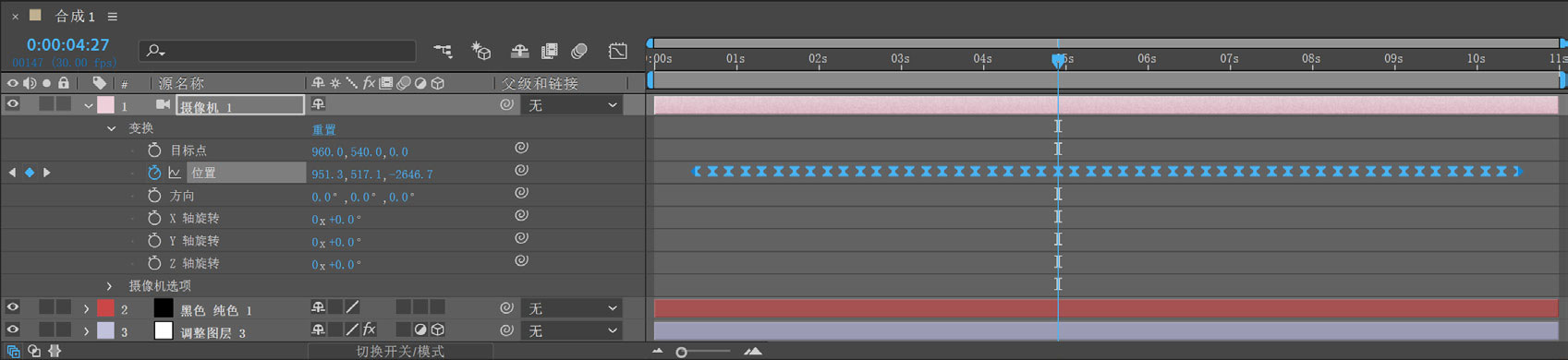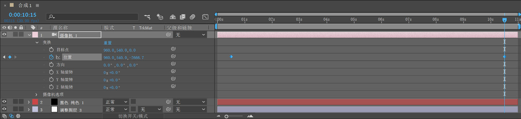 21 开启第3层~第10层的“3D图层”的开关。展开摄像机图层的“变换”选项,在15帧处为“位置”参数创建关键帧,在10秒15帧处添加一个关键帧,如图5-23所示。