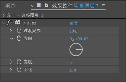16 选择“图层→新建→调整图层”命令,继续选择“效果→过渡→百叶窗”命令。在“效果控件”面板中设置“过度完成”参数为10%,“方向”参数为0x+90°,“宽度”参数为5,“羽化”参数为2,如图5-19所示。