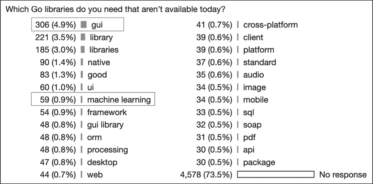 Go语言目前在GUI、机器学习(Machine Learning)等开发领域占有的份额较低,这很可能与Go标准库没有内置这类包有关。在2017年的Go语言用户调查 [1] 中,Gopher最希望标准库增加的功能中,GUI、机器学习包就排名靠前,见图3-7。(2017年以后的Go用户调查中,该问题没有被列入调查项当中,因此这里使用了2017年的数据。)