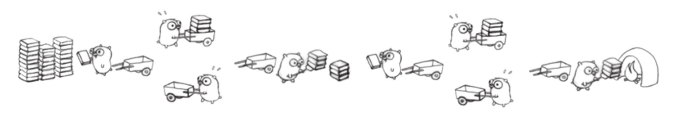 以上观点的重点是,并发是一种程序结构设计的方法,它使并行成为可能。不过这依然很抽象,这里借用Rob Pike分享中的那个“搬运书问题”来重新诠释并发的含义。搬运书问题要求设计一个方案,使gopher能更快地将一堆废弃的语言手册搬到垃圾回收场烧掉。