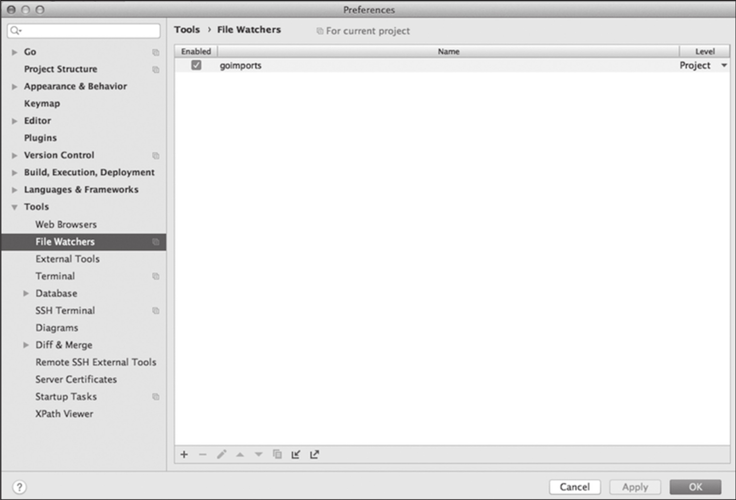 在保存文件时自动执行gofmt/goimports对源文件进行格式化的设置方法如下:在“Pereferences...”对话框中,依次选择Tools→File Watchers,然后添加一个File Watcher,选择go fmt模板或goimports模板即可(见图6-2)。