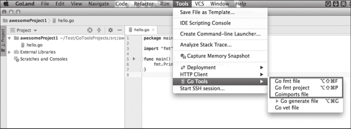 手工格式化的调用方法(以GoLand 2019.1.3版本为例,后续版本设置方法可能有所不同)是,在GoLand主菜单中依次选择Tools→Go Tools→Go fmt file/Go fmt project/Goimports file,如图6-1所示。