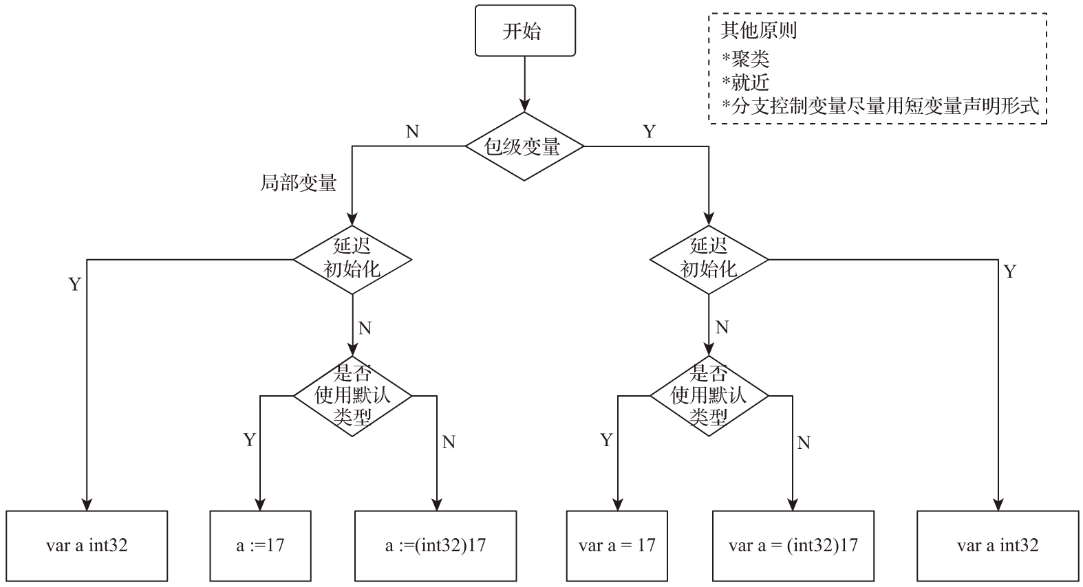 从图8-1中我们看到,要想做好代码中变量声明的一致性,需要明确要声明的变量是包级变量还是局部变量、是否要延迟初始化、是否接受默认类型、是否为分支控制变量,并结合聚类和就近原则。