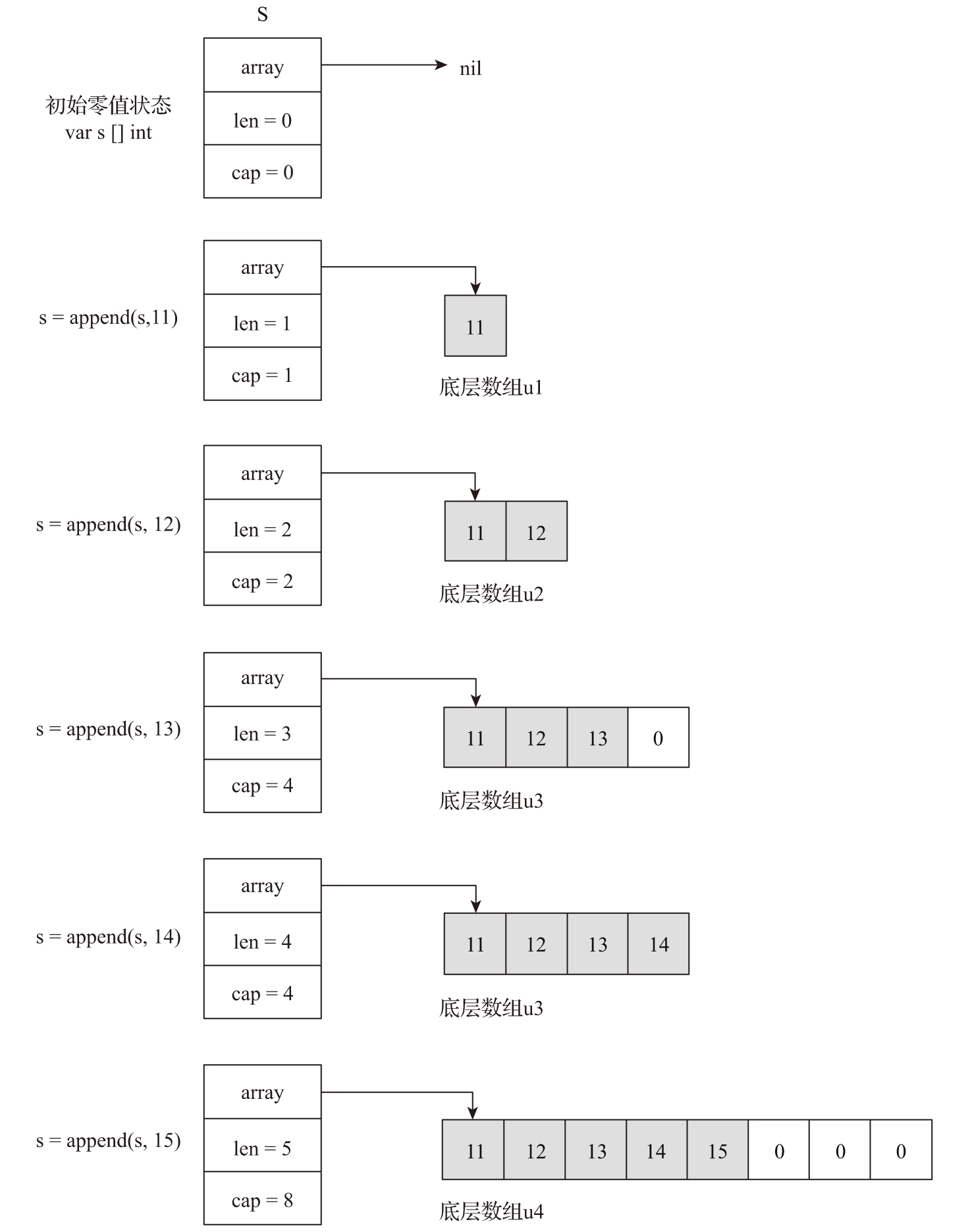 // chapter3/sources/slice_append.go var s []int // s被赋予零值nil s = append(s, 11) fmt.Println(len(s), cap(s)) //1 1 s = append(s, 12) fmt.Println(len(s), cap(s)) //2 2 s = append(s, 13) fmt.Println(len(s), cap(s)) //3 4 s = append(s, 14) fmt.Println(len(s), cap(s)) //4 4 s = append(s, 15) fmt.Println(len(s), cap(s)) //5 8