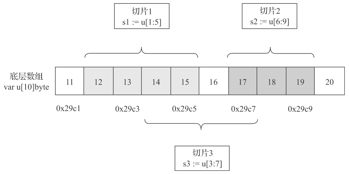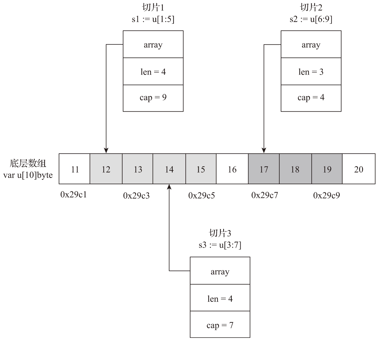 我们看到切片s打开了一个操作数组u的窗口,我们通过s看到的第一个元素是u[3],通过s能看到并操作的数组元素个数为4个(high-low)。切片的容量值(cap)取决于底层数组的长度。从切片s的第一个元素s[0],即u[3]到数组末尾一共有7个存储元素的槽位,因此切片s的cap为7。也可以为一个已存在数组建立多个操作数组的切片,如图13-4所示。