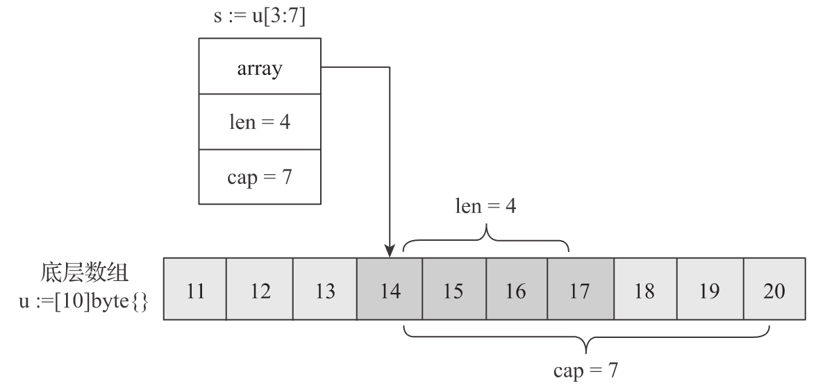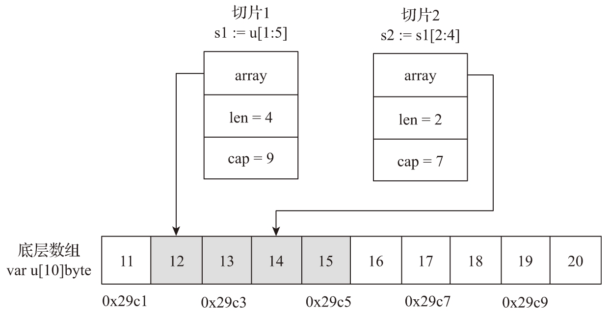 还可以通过语法s[low: high]基于已有切片创建新的切片,这被称为切片的 reslicing ,如图13-5所示。新创建的切片与原切片同样是共享底层数组的,并且通过新切片对数组的修改也会反映到原切片中。