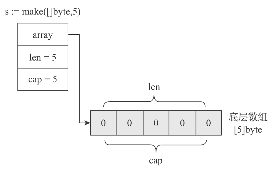 我们看到通过上述语句创建的切片,编译器会自动为切片建立一个底层数组,如果没有在make中指定cap参数,那么cap = len,即编译器建立的数组长度为len。