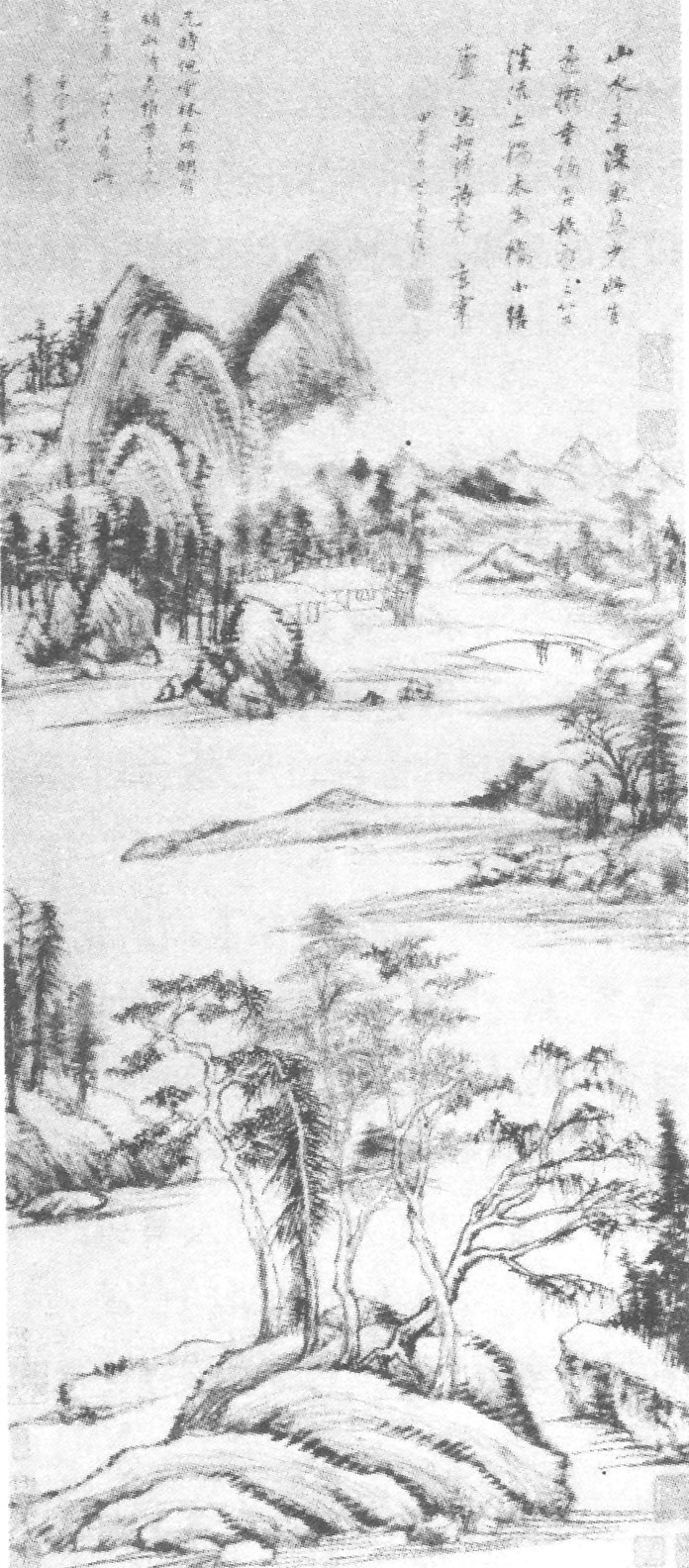 此画作山麓下林木深秀,临水有亭,隔溪板桥接岸;遥岑层叠起伏,云雾弥漫;岗陵转折深处,村舍掩映,暮霭茫茫。所表现的意境极富诗意。
