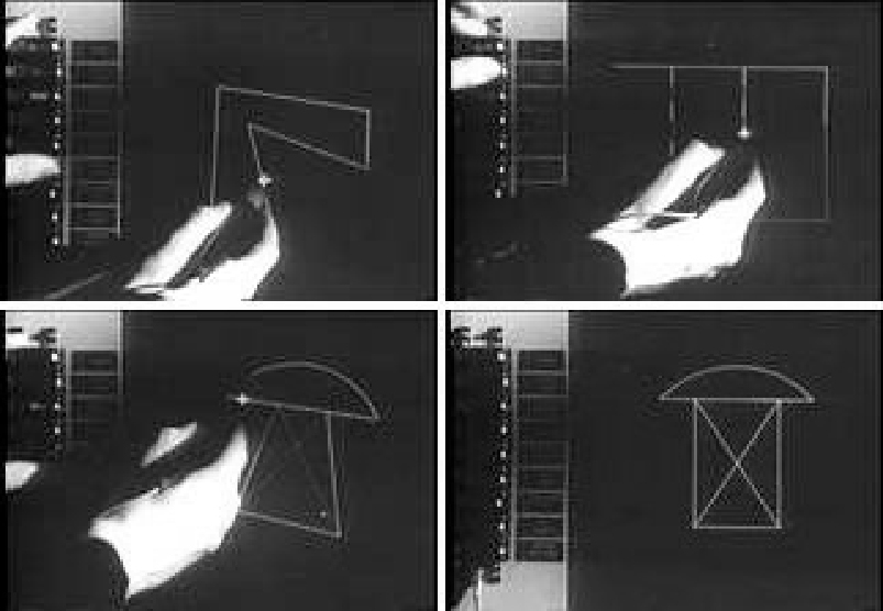 要知道,微软的视窗系统Windows1.0在1985年才发布,伊凡的计算机图形交互技术介入虚拟现实,其技术的先进性可见一斑。早在1963年,当伊凡完成他的博士论文的时候,仅用短短一年的时间就开发出了全世界第一个人机交互界面Sketchpad(如图3-1-6、图3-1-7所示),它是第一个使用完整图形用户界面的程序,在3D计算机建模和视觉模拟方面开辟了新天地,是计算机图形学和计算机辅助设计(Computer Aided Design,简称CAD)、计算机辅助制造(Computer Aided Manufacturing,简称CAM)的基础。作为现代计算机辅助设计的鼻祖,Sketchpad引发了计算机程序设计的革命。伊凡证明计算机图形不仅可以用于技术目的,也可用于艺术的用途。