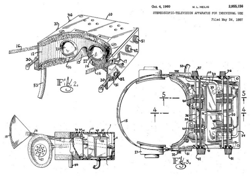 概念的想象可以天马行空,在较短时间内完成,但在科幻的外壳中注入硬核的科学技术,则需要花费大量的人力物力,还要遵循科技发展的规律。1955年,美国摄影师莫顿·海利阁(Morton Heilig)把这种沉浸式设备的想法又往前推进了一步,设计出了原型图,并于1957年获得了专利(如图3-1-3所示)。