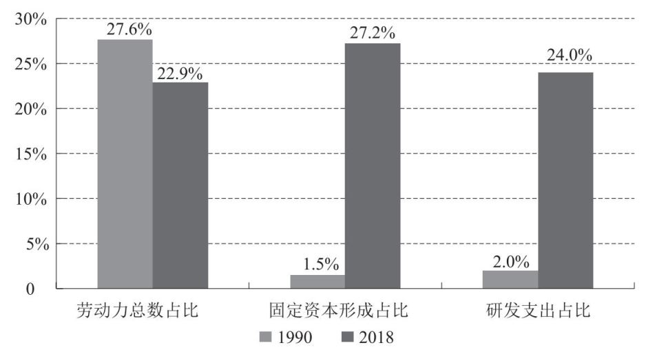 图1-3 1990年和2018年我国劳动力总数、固定资本形成、研发支出占世界的比重变化