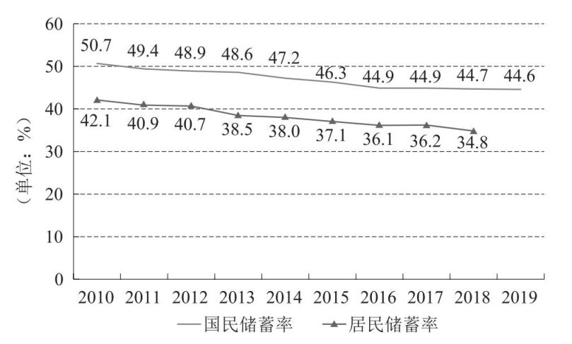 图1-4 2010—2019年我国国民储蓄率、居民储蓄率走势