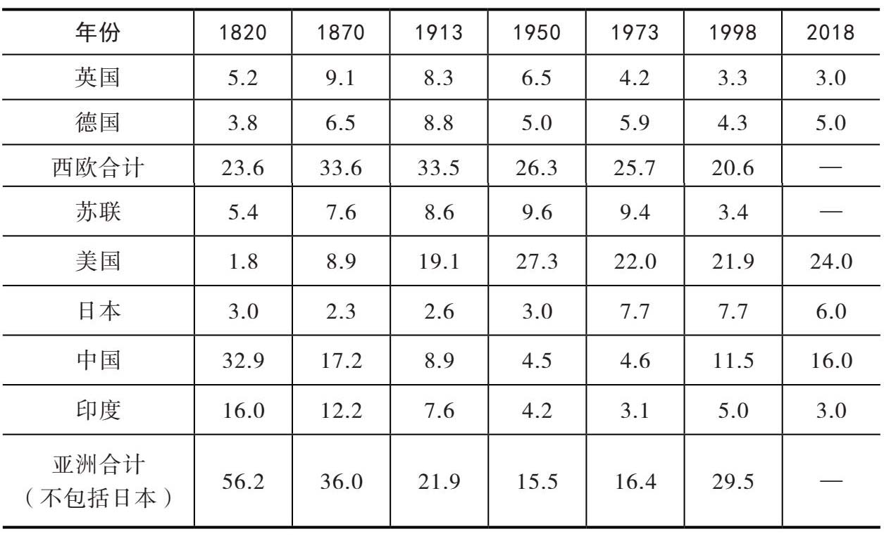 资料来源:1820—1998年数据来自麦迪森著《世界经济千年史》,2018年数据来自经济合作与发展组织的统计