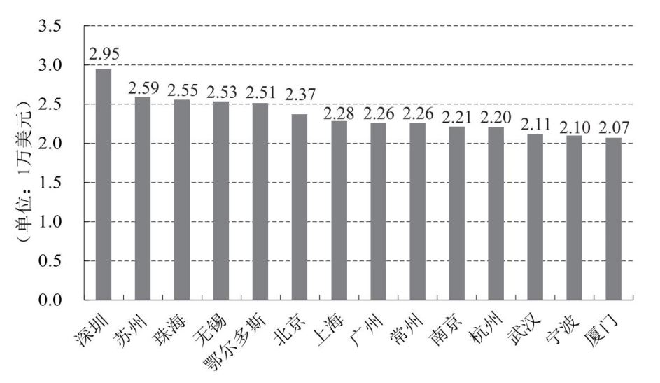 图1-2 2019年我国人均地区生产总值超过2万美元的14个城市