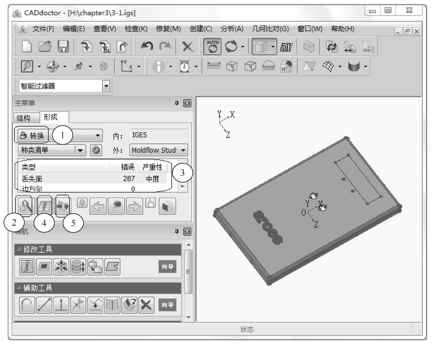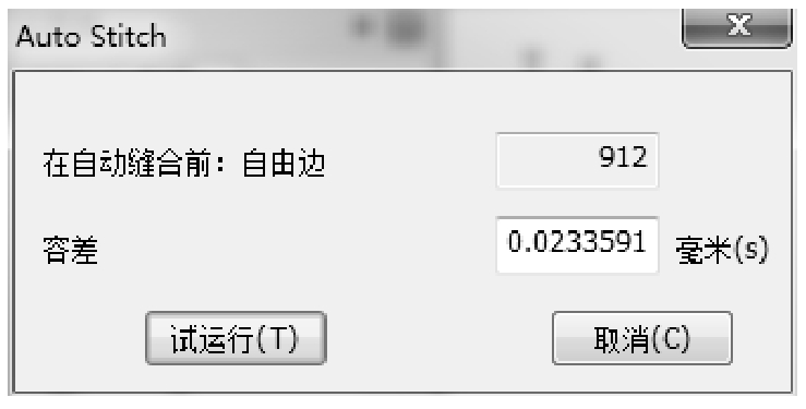 Step2:修复模型。在图3-3中“转换”(①)模式下,单击“检查”(②)按钮,找出需要修复的特征(如自由边、间隙、自相交、丢失面等)并统计(③中数据“287”),在模型上显示出来,然后单击“自动缝合”(④)按钮,弹出如图3-4所示对话框,“容差”可以根据需要自己定义,单击“试运行”按钮会弹出如图3-5所示对话框,单击“执行”按钮即可完成修复。