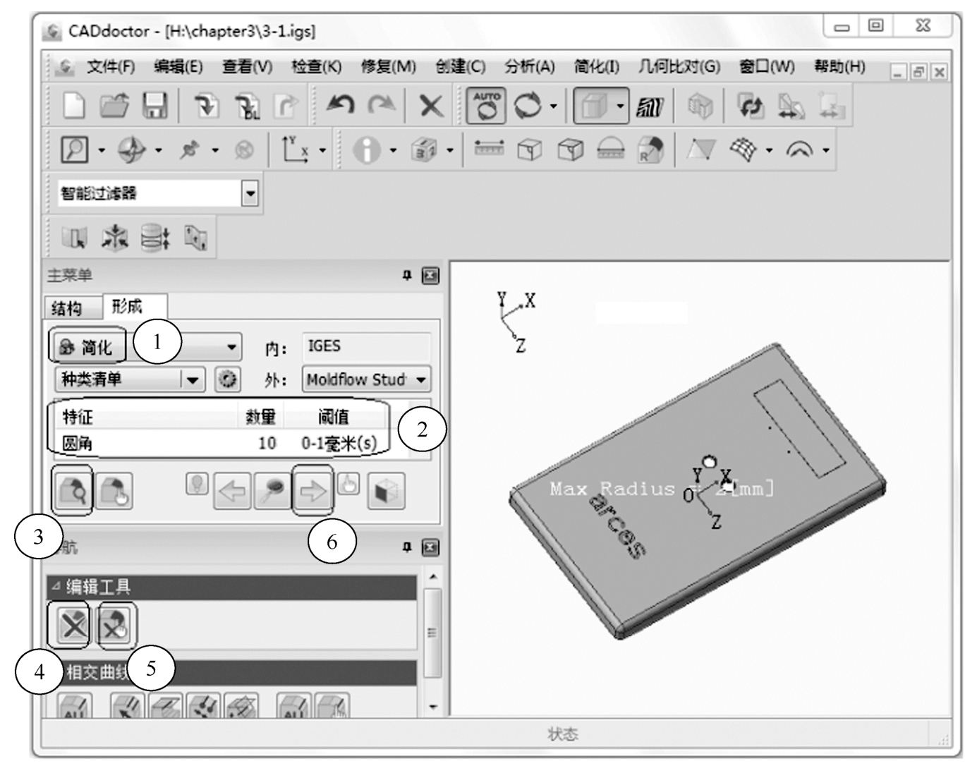 然后单击“删除所有(圆角)”(④)按钮,即可将统计出来的圆角全部删除。[也可以利用“移除(圆角)”(⑤)按钮和“下一个”(⑥)按钮有选择地移除相应的圆角。]