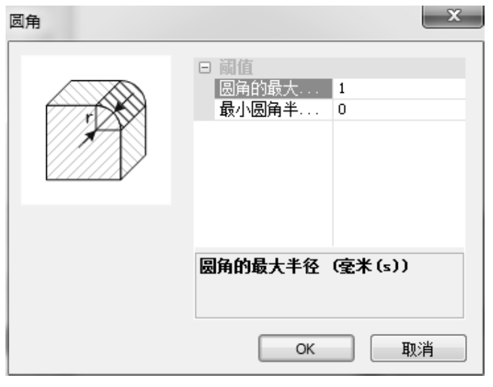 Step4:简化特征。首先根据产品实际情况,可将相应的特征(②中特征,如图3-7所示)修改“阈值”,这里在“圆角”上单击鼠标右键,选择快捷菜单中的“修改阈值”命令,弹出如图3-8所示对话框,将最大值设为“1”。