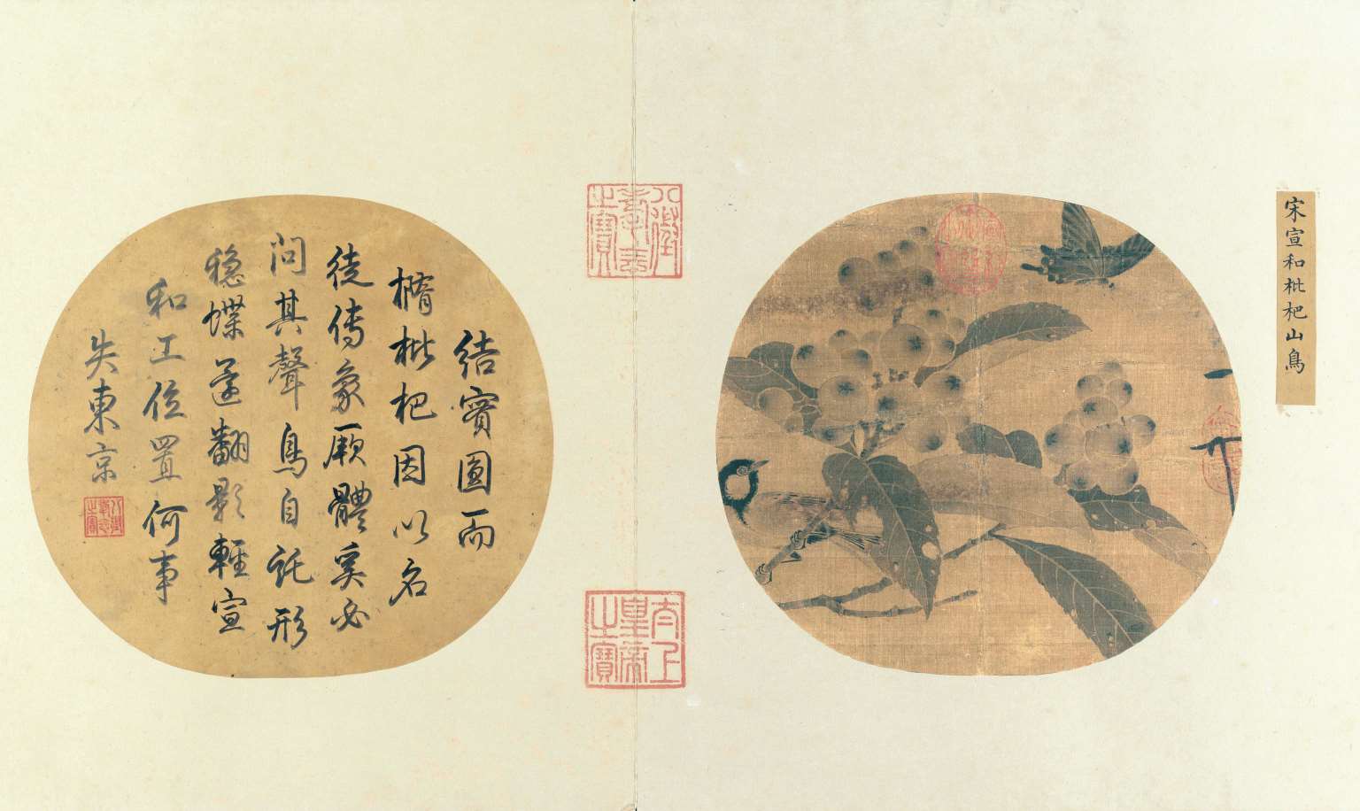 此画中枇杷果实累累,一只山雀栖于枝上,凤蝶于枝头翩翩飞舞。今传徽宗的花鸟画多设色,此画纯以水墨勾染,很有特点。对开上的乾隆御题诗也饶有意味,中有“宣和工位置,何事失东京”的感慨。经营位置是谢赫“六法”之一,是中国画构图的重要法则和“标准术语”。乾隆感慨道,徽宗既然如此工于绘画的“经营位置”,为何把江山丢了?乾隆此问,也代表了后世对徽宗的评判标准。