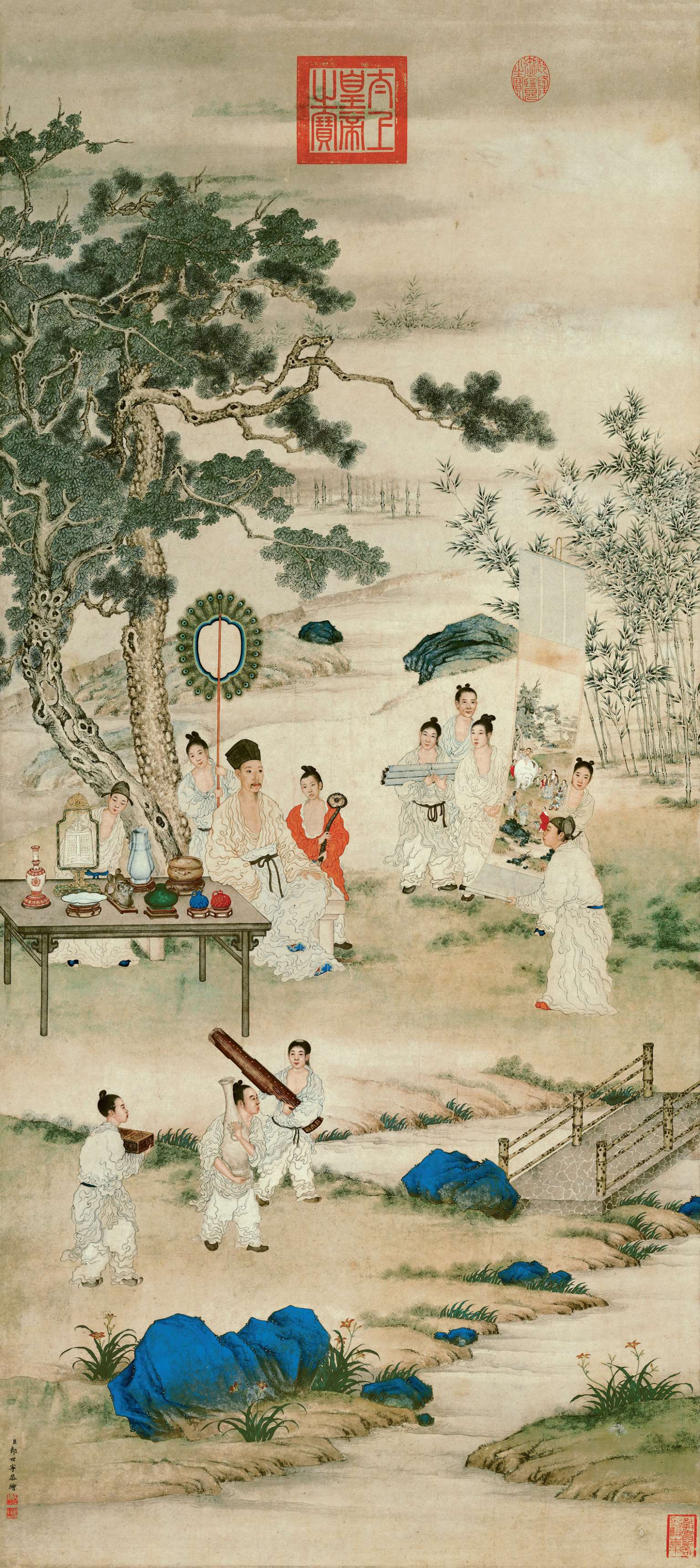 此画为清宫廷画家郎世宁所绘,人物面部写实,富有西画风格;衣纹用笔绵密,构图采用散点透视,配景有工笔画趣味,是典型的宫廷画画风,反映了郎世宁糅合中西的特点。郎世宁为意大利传教士,后入清宫廷,历康、雍、乾三朝,为皇帝所重。画中乾隆着便服坐于石墩上,右边的案几摆满各种珍玩,宫女、太监等人或持如意,或整理案几上的陈设,或抱画,或持琴,或展轴供乾隆欣赏。此画也真实反映了乾隆嗜好收藏的雅兴。
