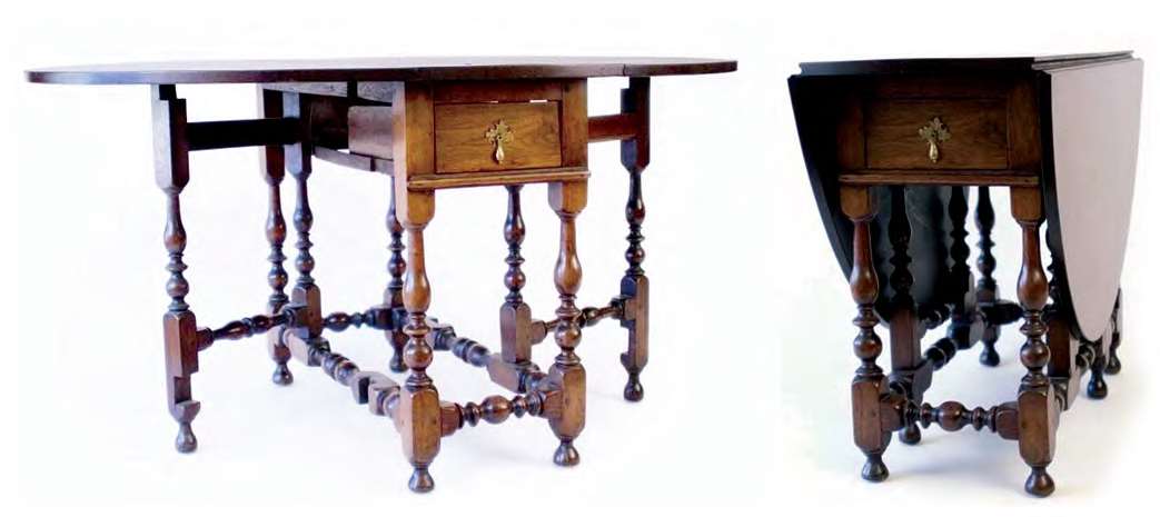 此张折叠桌(Gateleg Table)在回转部位采用金属件,转动灵活,开启自如,旋木圆腿、球形桌脚为其主要特点。