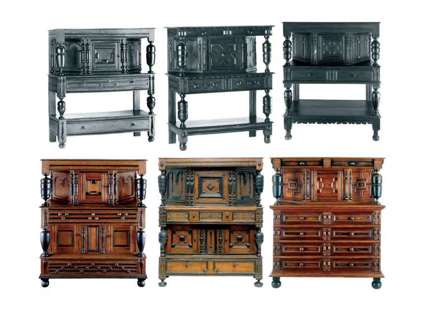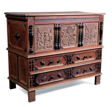 17 世纪 80 年代流行于马萨诸塞州的陈列柜(Cupboard),其基本形式源自文艺复兴时期的餐具柜(Buffet),但由于美国缺少能够精雕细刻的能工巧匠,人体柱等变为容易加工的果球类回转体,宗教题材的高浮雕变为几何纹样或自然纹理的浅浮雕。陈列柜的基本构成元素有三种,即开放的“架”、封闭的“柜”和可以拉出的“抽屉”。早期的陈列柜基本上是这三种元素的组合,后来也出现了“架”中套“柜”的组合形式。