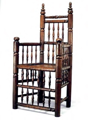 此扶手椅以圆棒件为主,在 1630—1660 年间流行于美国东北部的新英格兰地区。布鲁斯特(William Brewster,约 1566—1644)是北美殖民地建设的领导人之一,于 1620 年乘“五月花号”来到普利茅斯。作为船上唯一一个受过大学教育的人,他很快就成为移民中的领导人物。1830 年,布鲁斯特的后代将这件布鲁斯特用过的椅子赠送给了普利茅斯的清教徒移民博物馆(Pilgrim Hall Museum)。