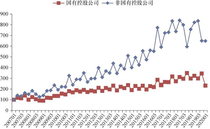 图2-4揭示了国有控股公司与非国有控股公司在各季度的价值创造额指数及变化趋势。可以看出,非国有控股公司的价值创造额指数明显高于国有控股公司;从价值创造额指数在时间序列上的波动趋势来看,在2008年之后,国有控股公司的增长趋势比较平缓,而非国有控股公司基本表现为强劲的增长态势,且国有控股公司和非国有控股公司的价值创造额指数差距逐年拉大。具体来看,进入2017 年,非国有控股公司的价值创造额指数的增长速度相比2017年以前进一步提升,由第1季度的591点增长到第4季度的835点,而国有控股公司的价值创造额指数在2017年第4季度才上升到300点以上; 2018年国有控股公司仍能保持在272~350点之间波动,而相比之下,由于国家去杠杆政策力度大,公司融资难度增大,加上中美贸易摩擦的影响,以及非国有控股公司在2018年第4季度计提巨额商誉减值准备,价值创造额下降,非国有控股公司的价值创造额指数在第4季度出现急剧下滑,跌至595点;自2019年以来,国家对非国有控股公司实施利好政策,非国有控股公司的价值创造额指数恢复性回升,但在2019年第4季度依旧受计提巨额商誉减值准备的影响再次出现急剧下滑; 2020年年初受到疫情冲击的影响,非国有控股公司生产经营受到较大影响,价值创造额指数未能有效回升。同样因为疫情的冲击,国有控股公司在2020年第1季度表现不佳,价值创造额指数明显下滑。
